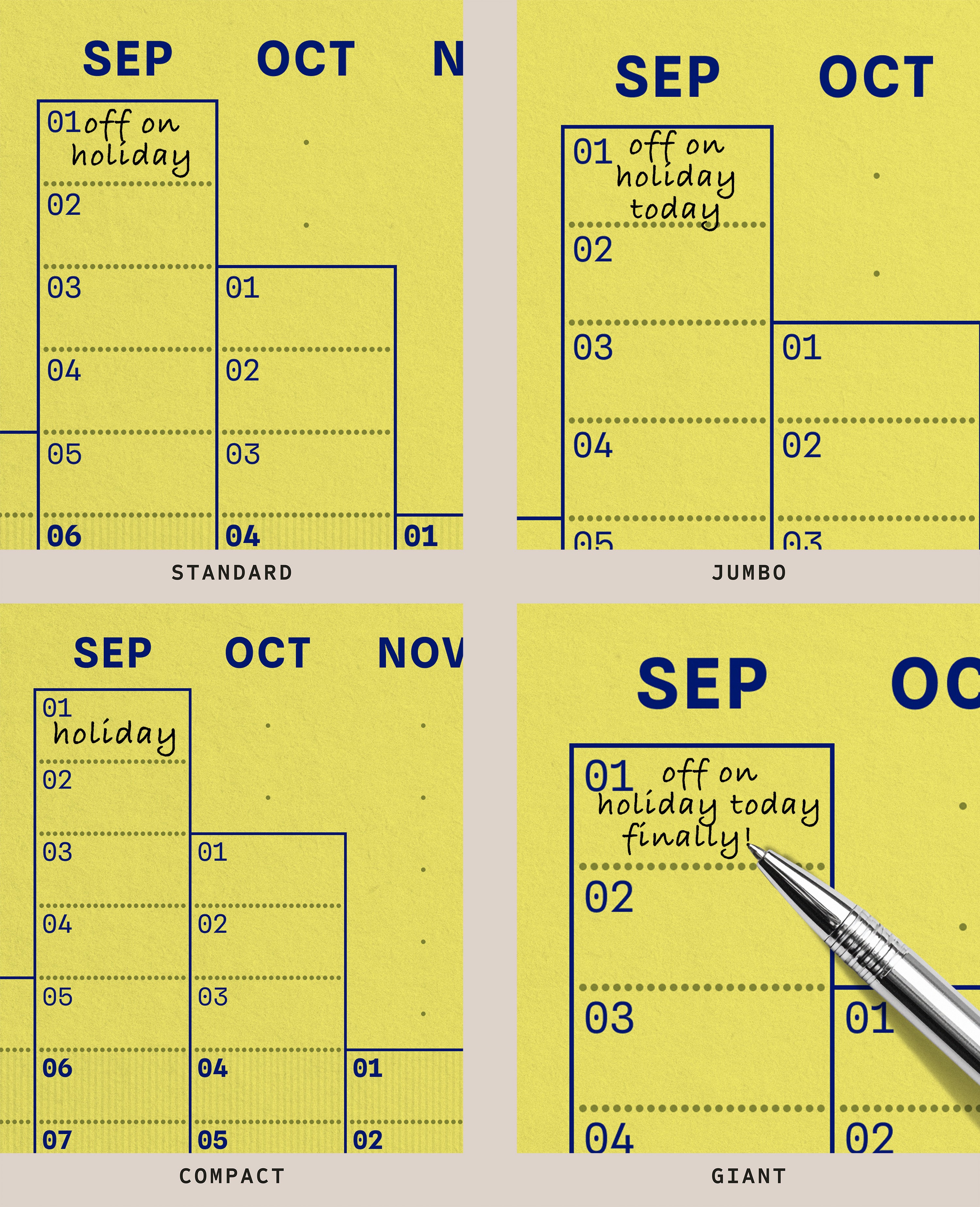 Dotline lets you visualise your year with its clean, typographic design emphasising clarity and legibility. Bright and energetic, with subtly highlighted weekends for quick orientation, combined with a thoughtful sunshine-inspired palette adds just enough visual interest without overwhelming your notes and appointments. The premium tactile paper provides a satisfying writing experience that digital planners cannot replicate.